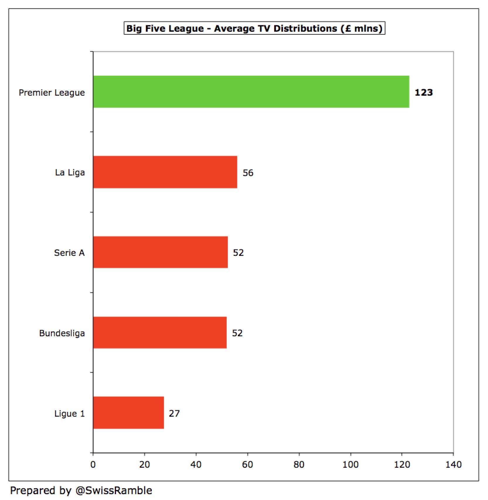 Η Πρέμιερ Λιγκ κυριαρχεί εδώ και χρόνια, όσο αφορά το οικονομικό σκέλος, έναντι του γερμανικού, του ιταλικού, του ισπανικού και του γαλλικού πρωταθλήματος.